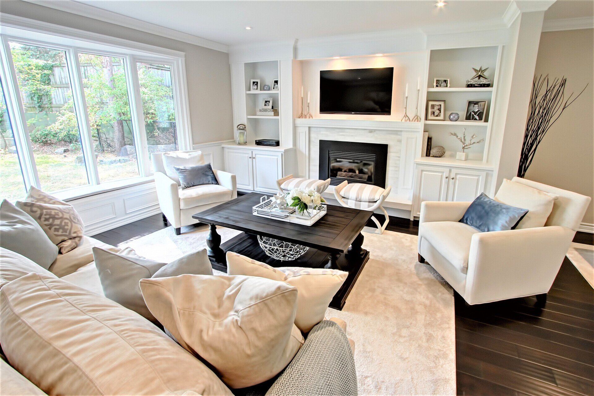 This stunning New England style home was renovated from top to bottom. Selecting a calm, soft colour palette and using it throughout the property gives the space great flow. Walls were opened up and new flooring laid. Custom furniture was mixed with a few existing pieces, and the whole home was accessorized with the neutral and pale blues of the beach. Rustic woods and nautical touches helped enhance the theme, and added character and texture to the space.