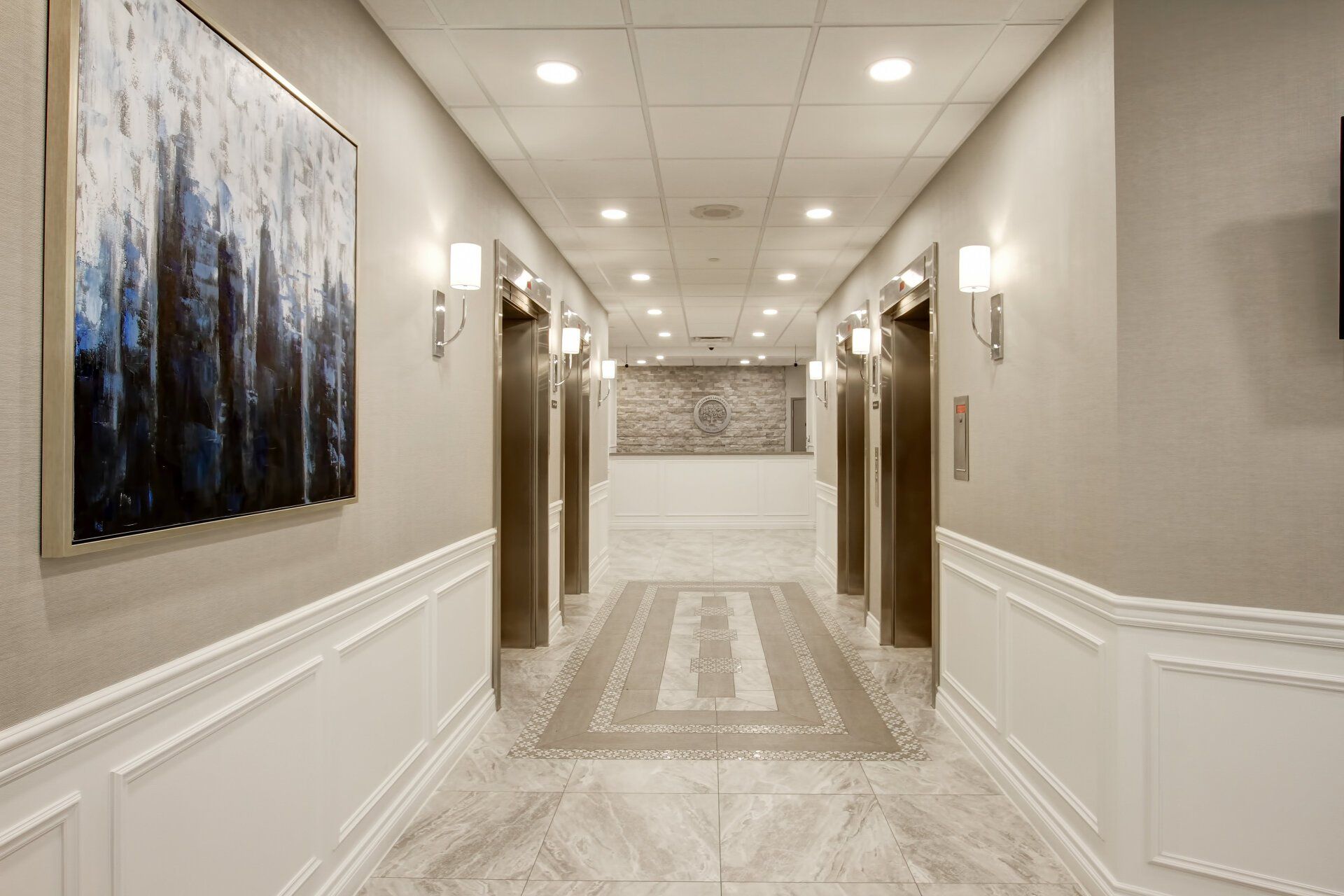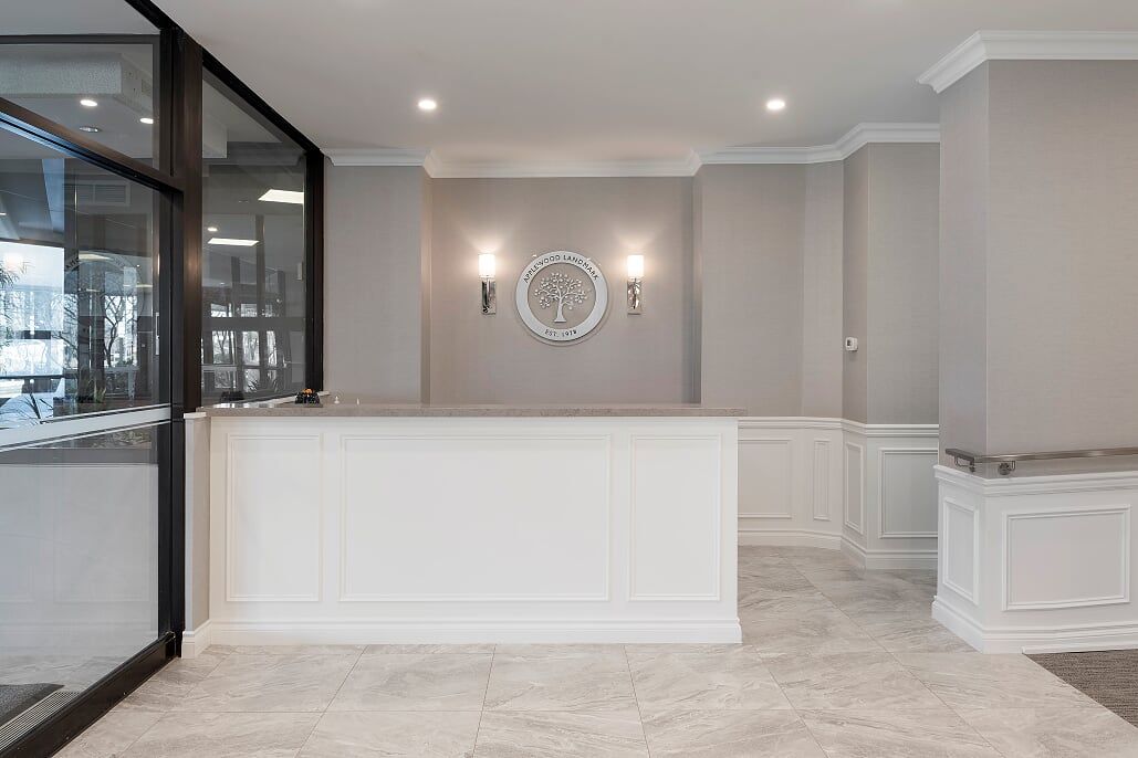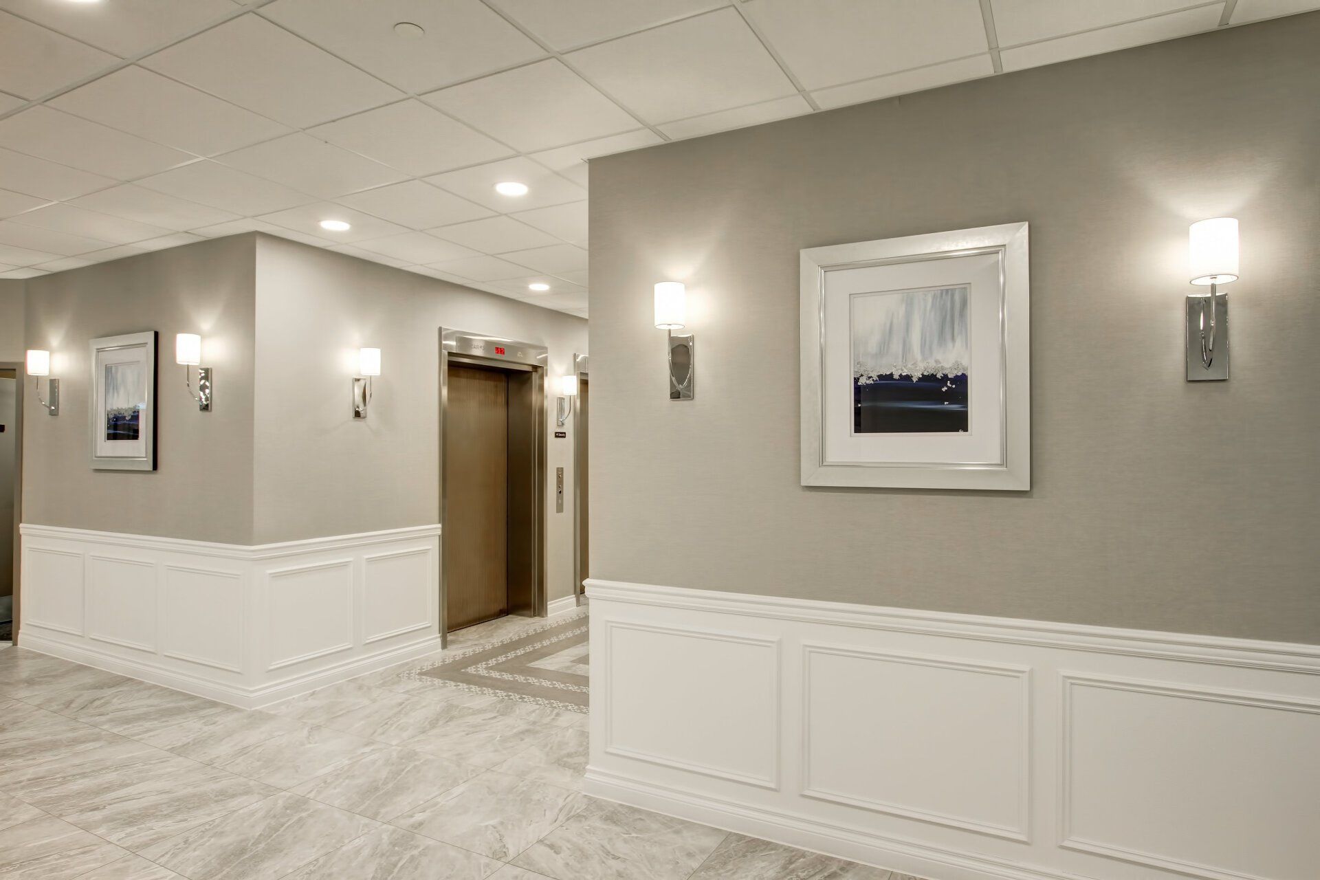 The lobby renovation at Bloor had a huge impact. The existing lobby had been very dark, with a yellow and brown colour scheme, brown tinted mirrors and pink granite flooring and planters. After carefully researching the demographic of the building we went with a classic, yet transitional design. By adding wainscoting, a feature fireplace, stunning lighting and furniture, along with a neutral colour scheme, we gave the space a timeless feel. The elevator lobby had a custom design tiled floor pattern to distinguish the space, and the corridors and suite doors on that floor were updated to compliment the scheme.