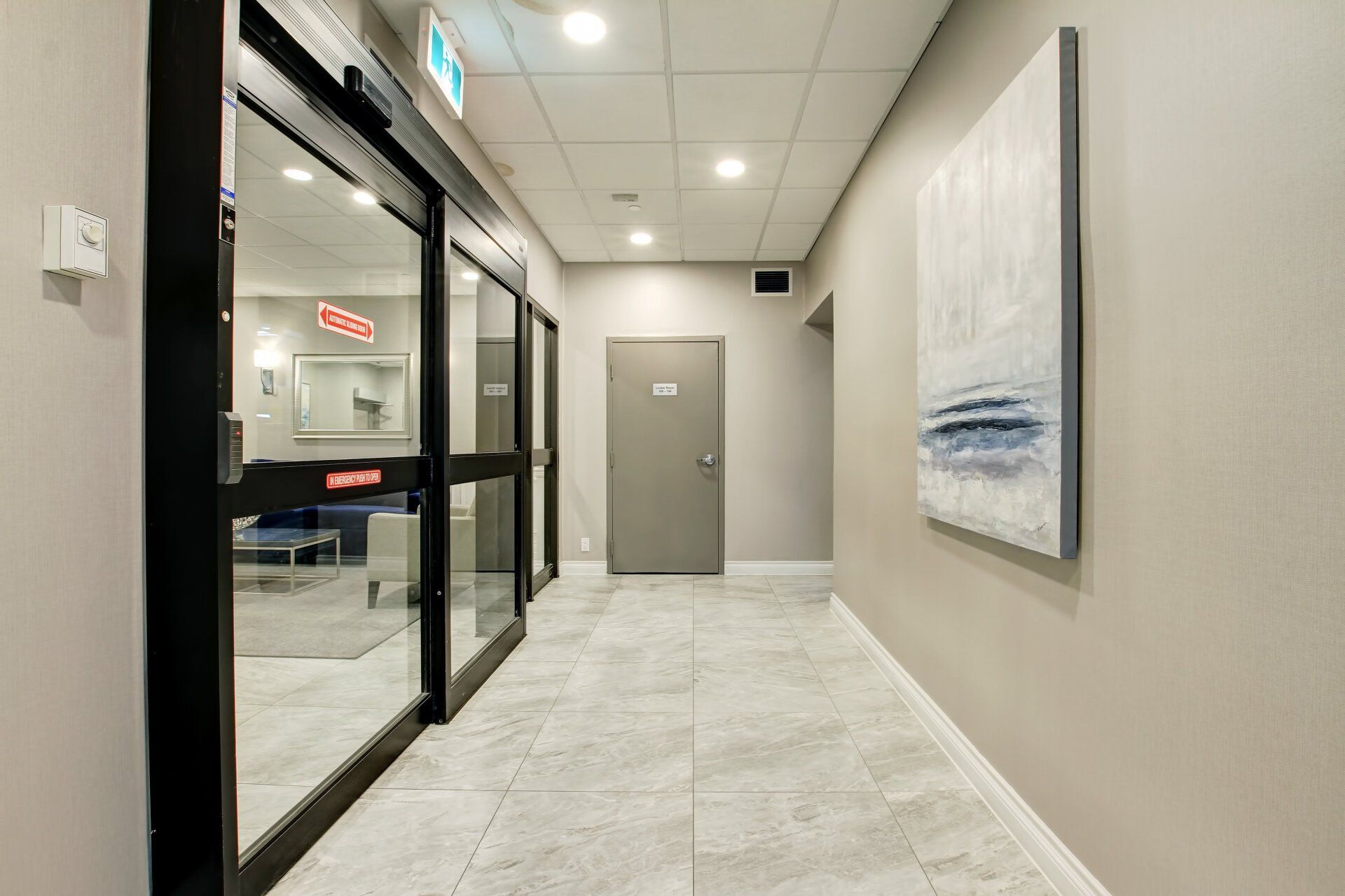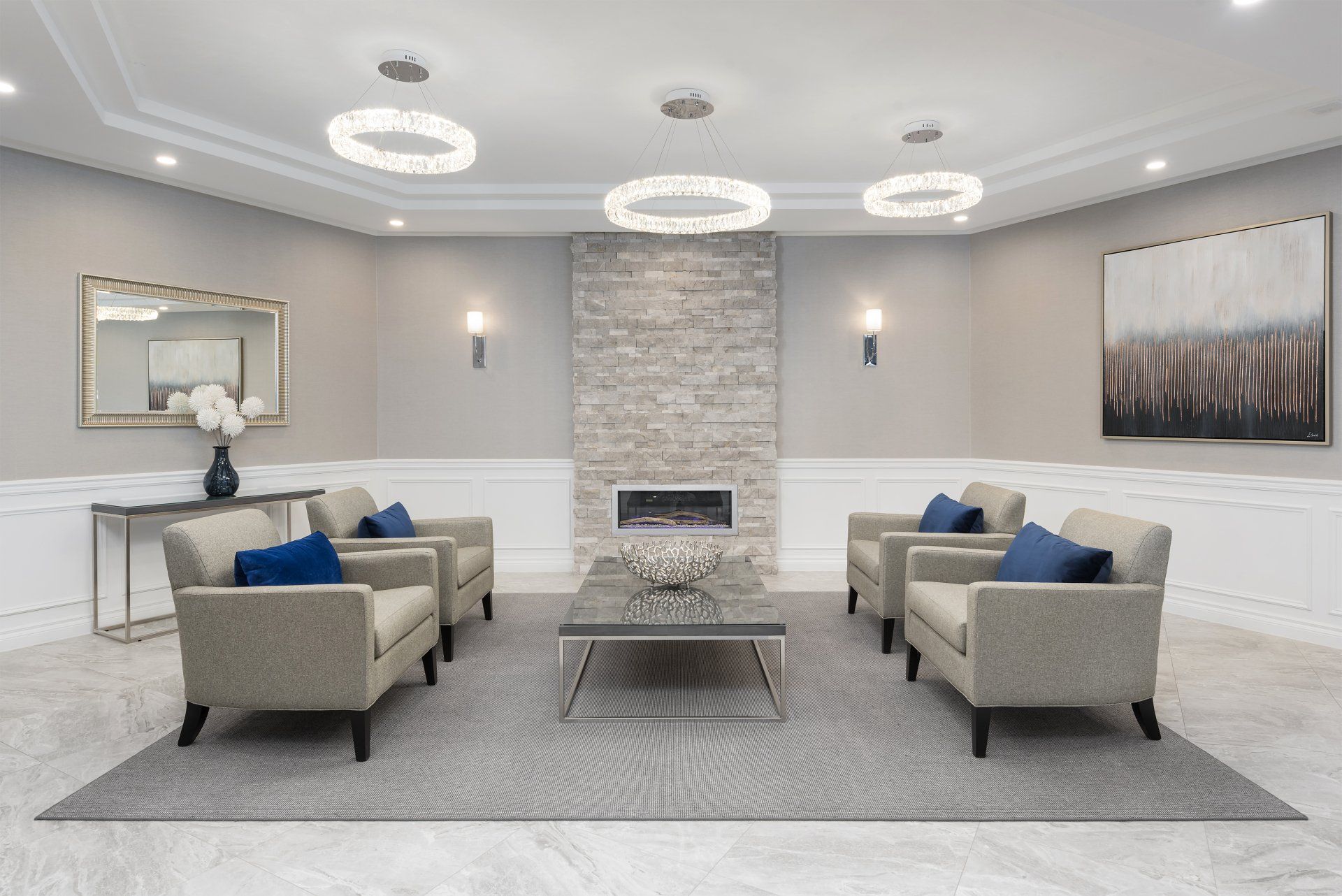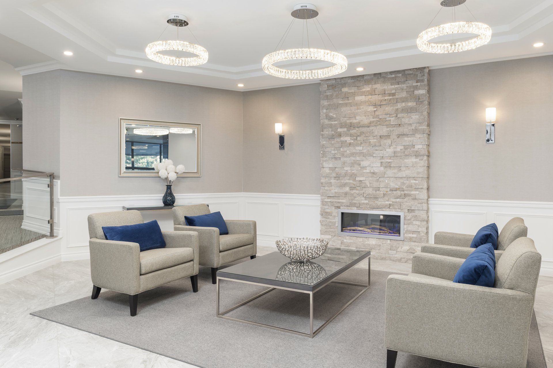 The lobby renovation at Bloor had a huge impact. The existing lobby had been very dark, with a yellow and brown colour scheme, brown tinted mirrors and pink granite flooring and planters. After carefully researching the demographic of the building we went with a classic, yet transitional design. By adding wainscoting, a feature fireplace, stunning lighting and furniture, along with a neutral colour scheme, we gave the space a timeless feel. The elevator lobby had a custom design tiled floor pattern to distinguish the space, and the corridors and suite doors on that floor were updated to compliment the scheme.