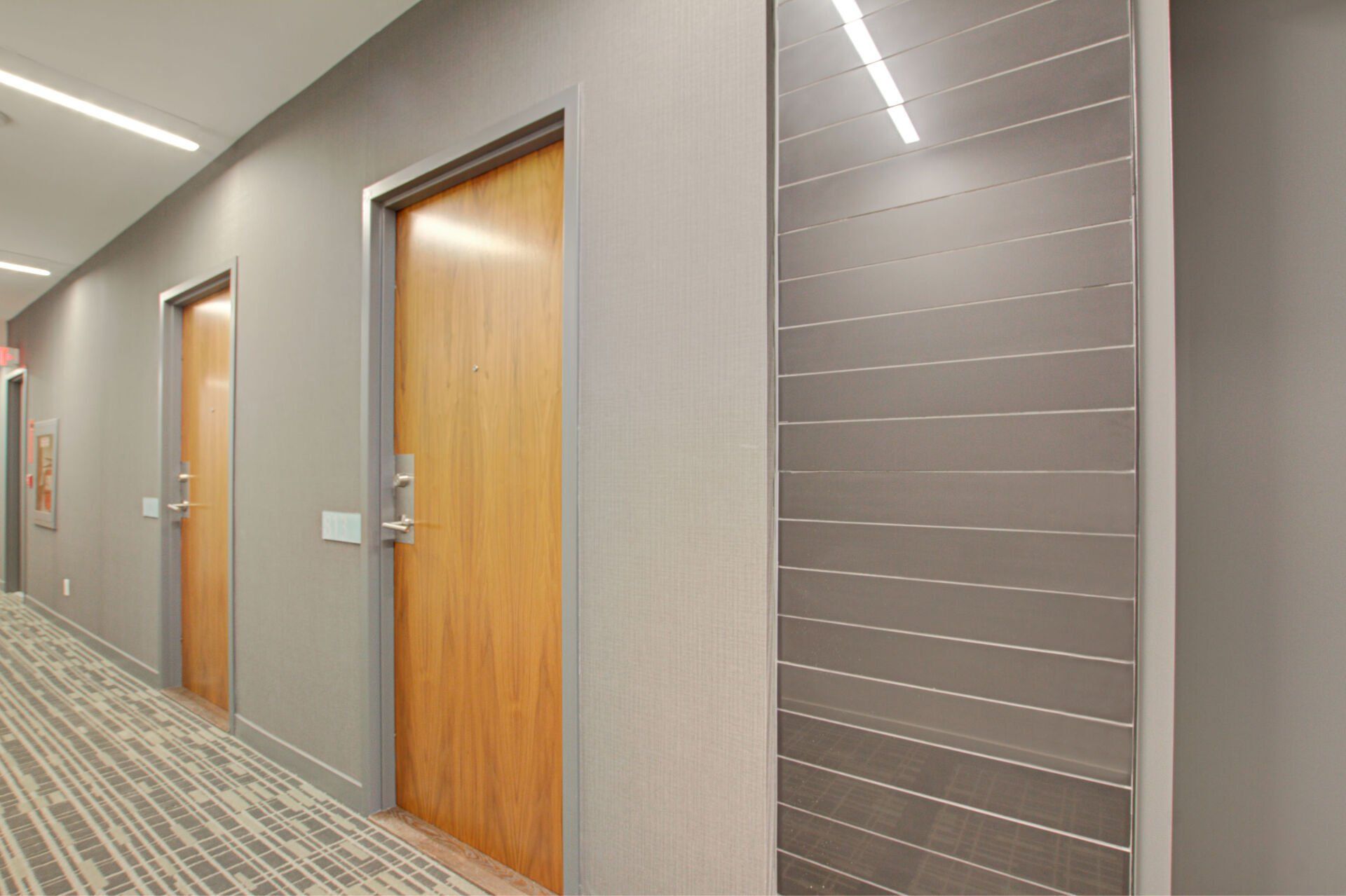 The corridor renovation at Fort York required new carpet and wall coverings to make the space more durable and fit for purpose. The contemporary design of this building called for clean lines and a continuation of the colour scheme used throughout the rest of the building. Textured, vinyl wallcoverings in grey and white were selected for the walls and a custom designed carpet for the floors. The elevator area was accentuated by a border in the darkest colour from the carpet to make it distinguishable to those living on the floor.