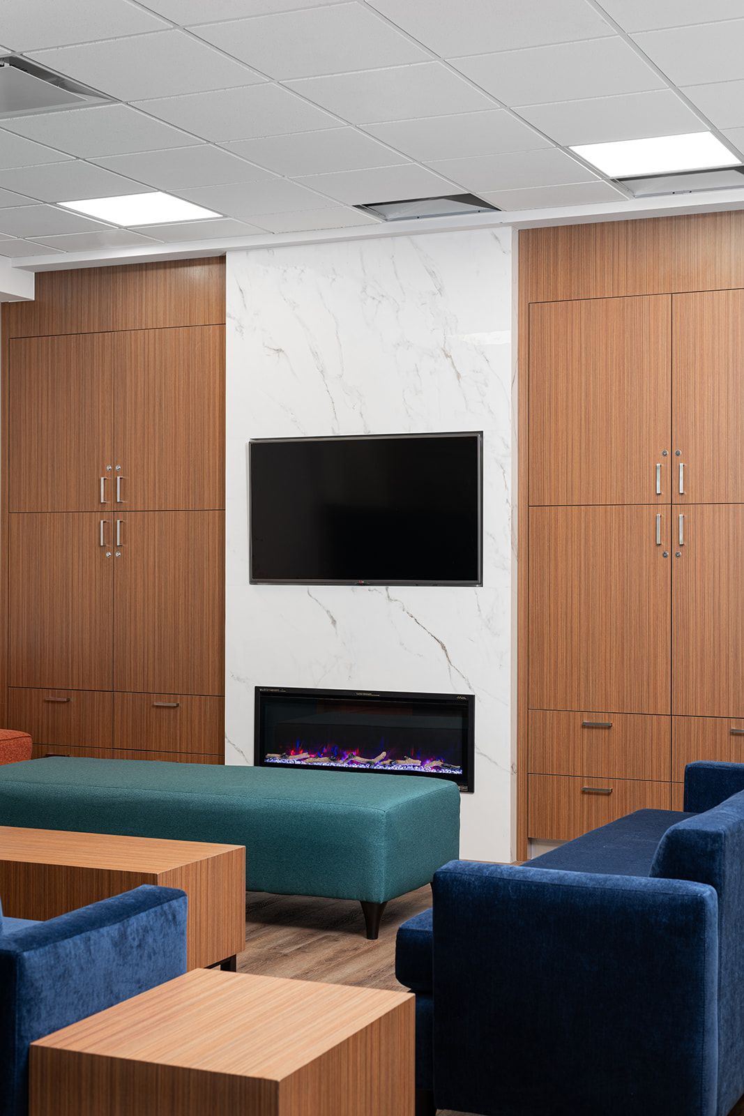 The refurbishment and expansion of Hope City Church in Brampton was an exciting and diverse project enabling us to create different spaces for the varying needs of the congregation. This included a large new daycare space, youth areas, café, seating area and washrooms. Working in collaboration with Berkim Construction, Reinders + Law Architects and West Arbor for millwork, this bright open space came together beautifully. Working with the clients brand colours or orange, teal and navy this welcoming space has something for everyone.